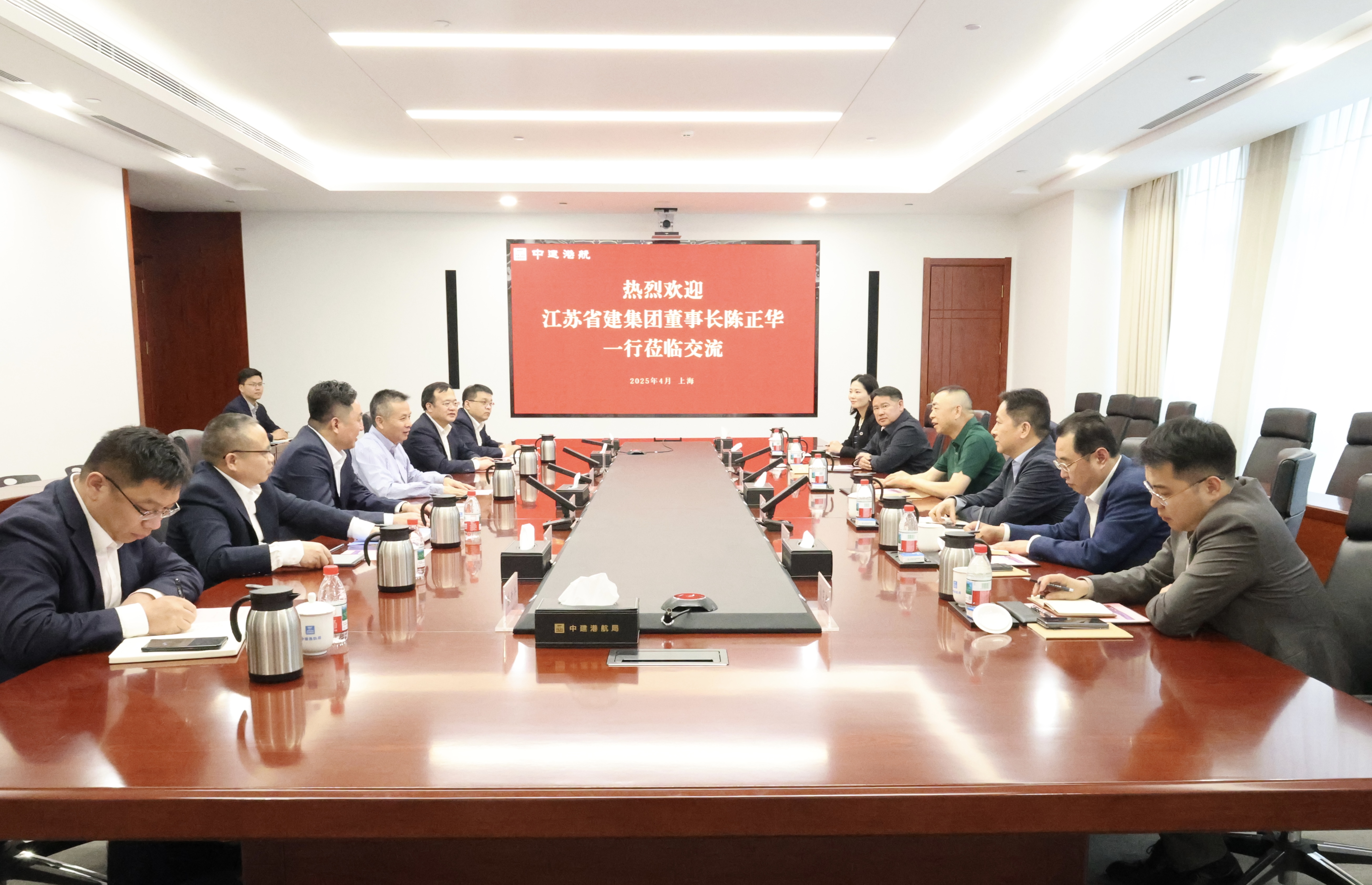 4月7日,集团董事长陈正华与中建港航局党委书记、董事长陈浩在上海举行工作会谈,双方就深化优势互补、加强业务合作进行深入交流。中建港航局党委副书记、总经理刘同敬,集团党委书记、执行总裁张震宇参加会谈。