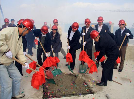 ■嘉宾们共同挥锹,为大楼填上最后一方混凝土