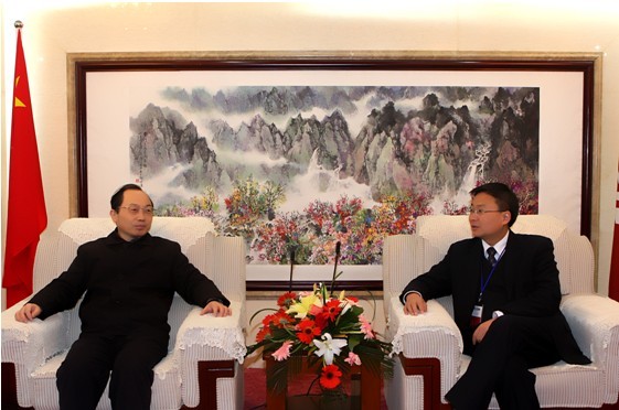 █ 仇天青总裁向省住建厅党组成员、纪检组长张宁宁(左)介绍企业发展情况