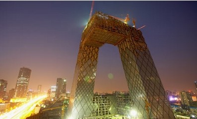 这一壮观的建筑,以巨大的、超现实的中文书法字符作为灵感来源,在2008年奥运期间完成了主体结构。但现在,它里面还没有任何东西。在2009年年末,它将成为央视的总部,并且,将向公众开放。这幢大楼的动力学设计由荷兰建筑大师雷姆·库哈斯和德国建筑师Ole Scheeren完成,而Cecil Balmond则担任设计工程师。这个设计不得不说是个奇迹。