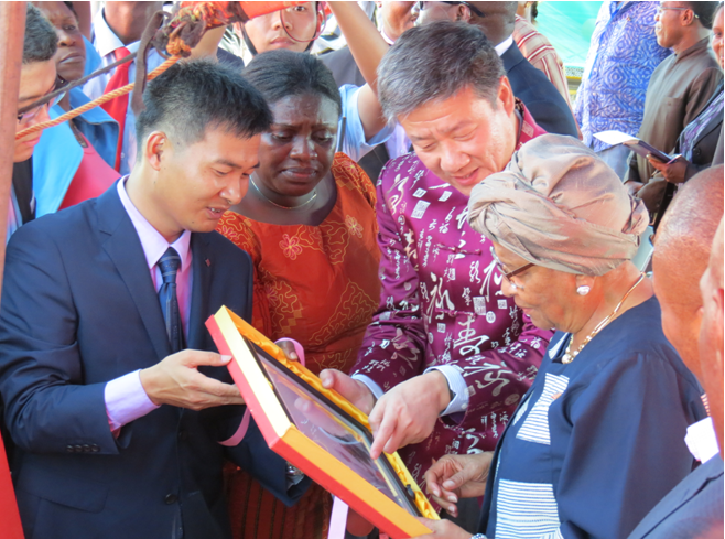 仪式最后,援利比里亚政府项目组代表高元明向利比里亚总统赠送礼物,祝福中利友谊长存。