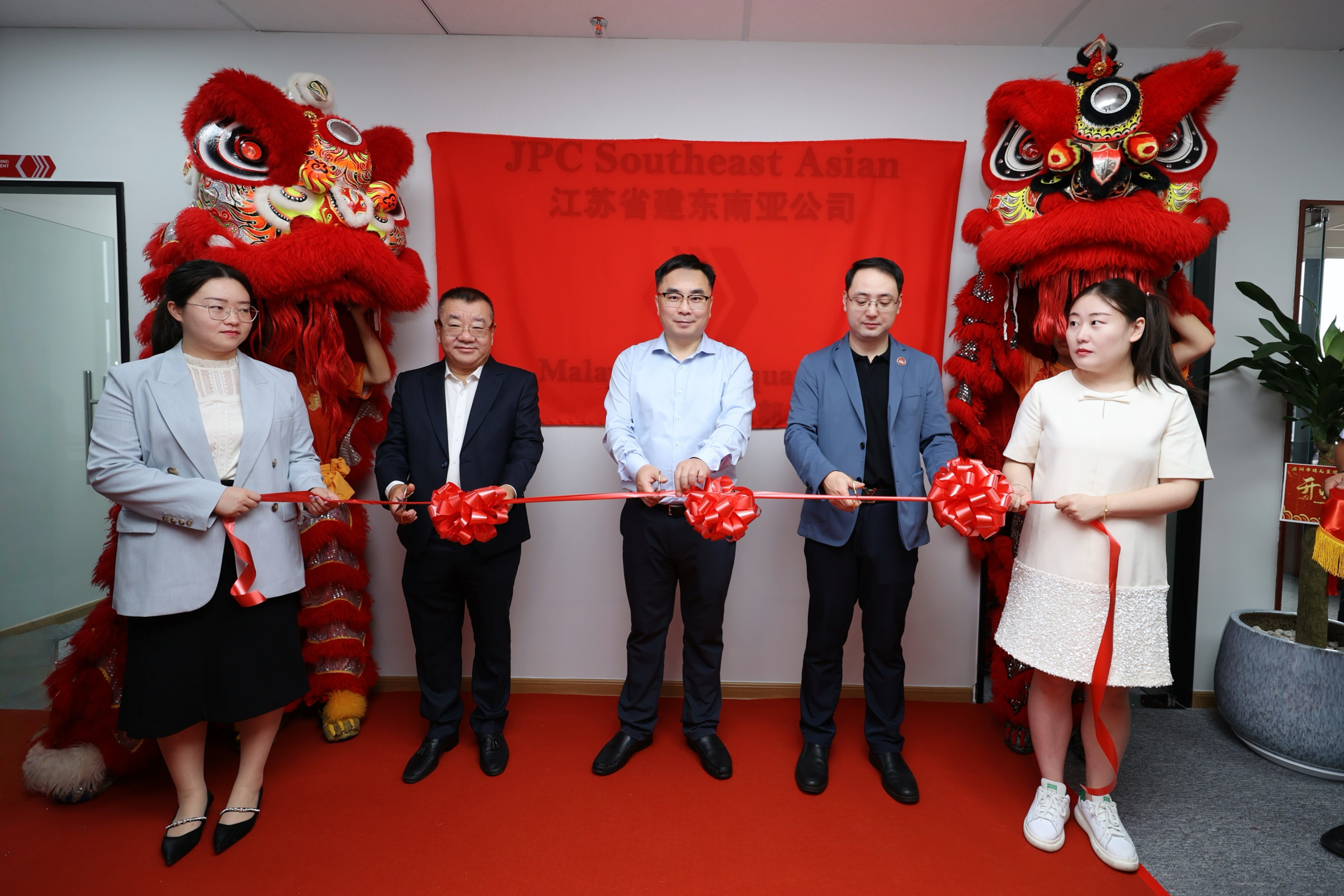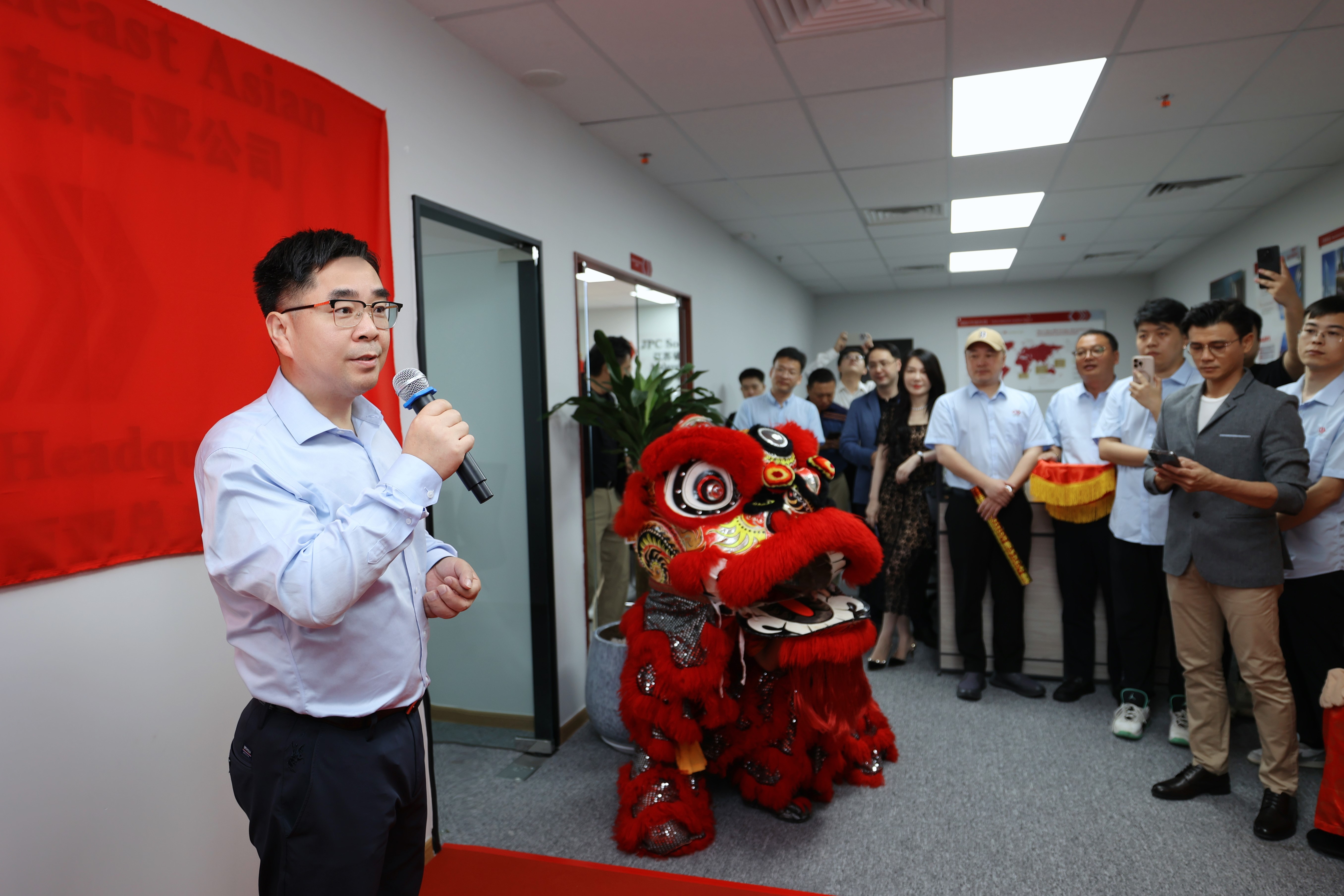 在热烈的掌声中,金红双狮腾跃起舞,蒋宁和出席活动的领导嘉宾共同为东南亚公司总部揭牌,崭新的招牌在狮舞祥瑞中熠熠生辉,标志着集团海外事业发展迈向全新阶段,开启全新征程。