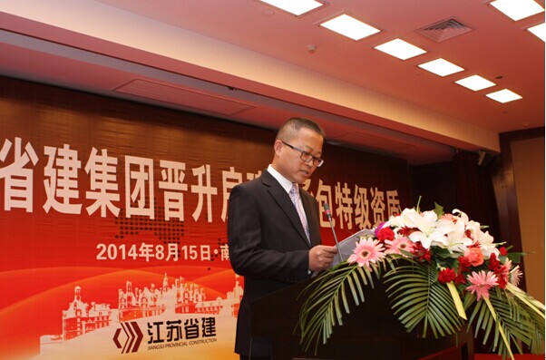 省住建厅副厅长徐学军祝贺江苏省建申特梦想成为现实。他说,省建申特一举成功,在全省率先取得新一轮特级资质,值得全省建筑业庆贺,而省建的历史将翻开新的一页。他希望江苏省建集团吃透中央城镇化会议精神,抓住这难得的发展机遇,继续坚持人才战略、管理现代化战略、质量兴业战略和品牌战略,积极提升企业的市场占有率、核心竞争力、产值利润率和品牌影响力,从而做大做强企业的综合实力。他还将“新起点、新征程,共创明天新辉煌;抓机遇、迎挑战,谱写省建新华章”两句话赠送给与会人员,勉励全体省建人以特级资质为切入口,抢抓战略机遇,为推动全省建筑业又好又快发展作出新贡献。